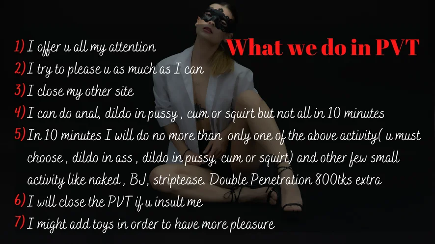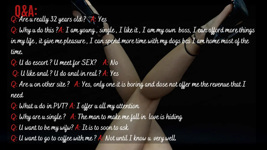 Anaali, Suihinotto, Syväkurkku, Creampie, Tuhmat puheet, Dildo tai vibraattori, Eroottinen tanssi, Masturbointi, Orgasmi, Squirttaus, Strippaus, Tissipano, Yläosattomissa, Twerkkaus, Ahegao, Anaalilelut, Lehmityttö, Vilauttelu, Lateksi, Nahka, Nännilelut, Suihku, Upskirt, Camel Toe, Doggy Style, Facial, Sormetus, Hardcore, Runkkaus, Gape, Runkkausohjeet